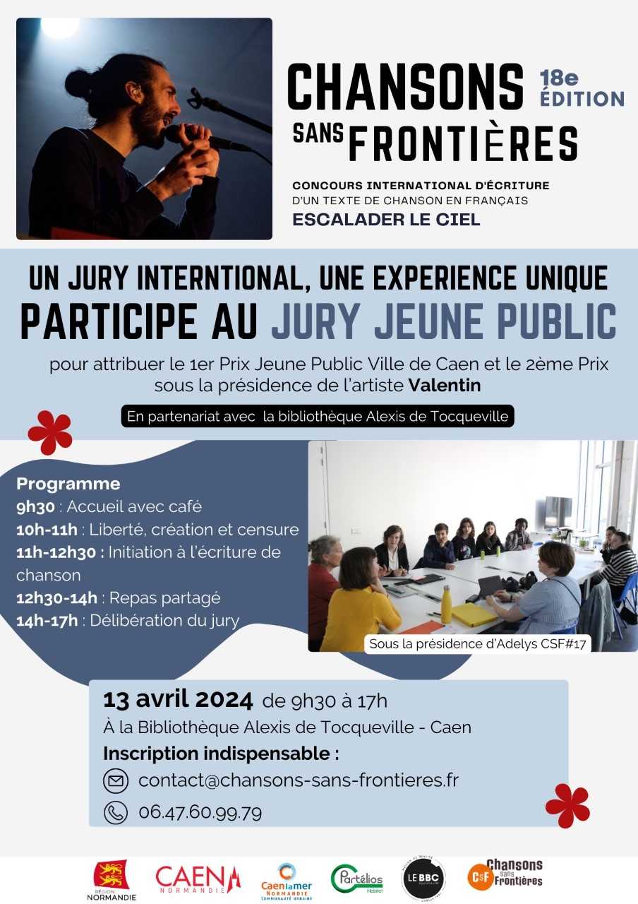 Du 13 au 14 avril 2024, en collaboration avec la Ville de Caen et la bibliothèque d'Alexis de Tocqueville, CSF organise le jury jeune public composé, de jeunes entre 17 et 30 ans pour élire les lauréats des :
