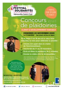 Dans le cadre du Festival des Solidarités du 13 au 29/11/2020, la Ville d’Hérouville Saint-Clair organise un concours de plaidoiries ouvert aux jeunes hérouvillais sur les thèmes du climat et du développement durable.