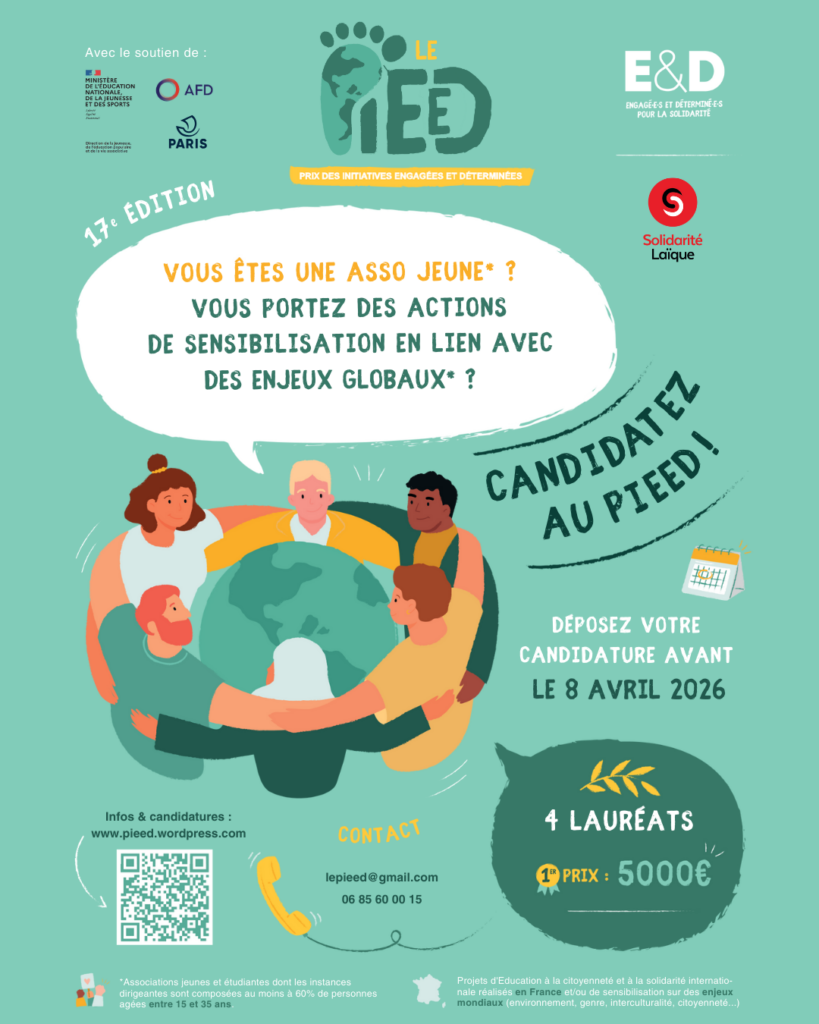 Co-porté par Engagé·e·s & Déterminé·e·s (E&D) et Solidarité Laïque, le PIEED est un dispositif national qui soutient et valorise les projets portés en France par des associations de jeunes, associations étudiantes et Junior Associations, engagées dans le champ de l'Éducation à la Citoyenneté et à la Solidarité Internationale (ECSI).