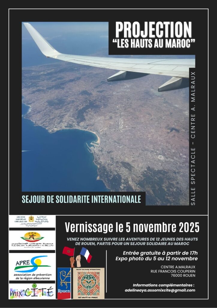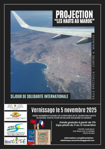 Le mercredi 5 novembre 2025, l’équipe jeunesse de mix’CITÉ, les jeunes, les bénévoles ainsi que nos partenaires du Rouen info jeunesse (RIJ des hauts de Rouen) et de l’Association de prévention de la région elbeuvienne (APRE) vous convie pour une journée placée sous les couleurs du Maroc !